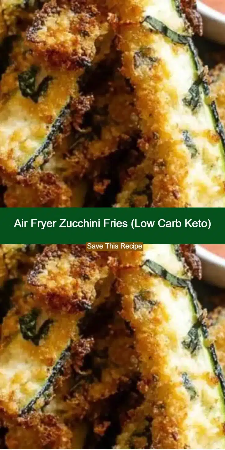 Crisp, golden zucchini fries made in the air fryer for a low-carb, family-friendly snack or side, featuring a crunchy almond flour and parmesan coating.