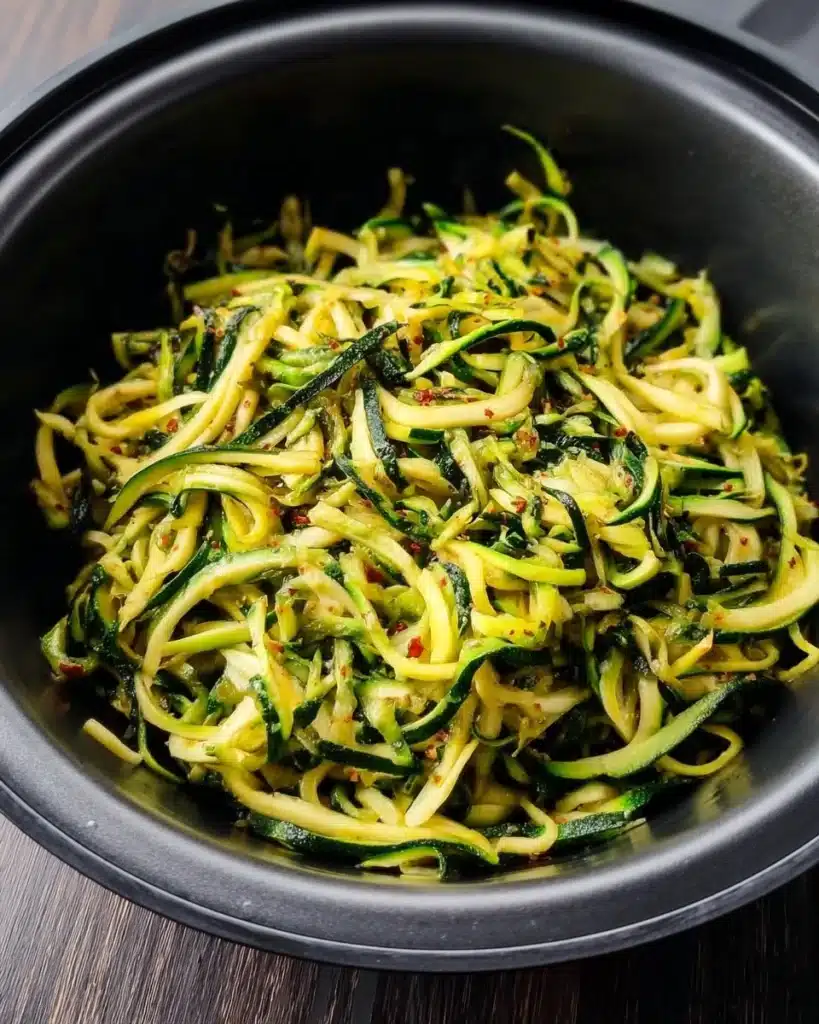 • In a large bowl, toss the zucchini noodles with olive oil, garlic powder, and salt and pepper until evenly coated.