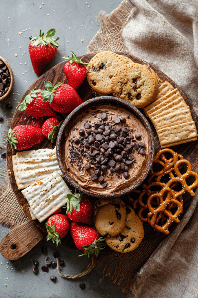 This dip loves variety. Fresh strawberries and apple slices bring a refreshing contrast. Salty pretzels and crackers give that sweet-salty crunch. Graham crackers, vanilla wafers, and marshmallows make it extra indulgent. You can even serve it with mini donuts or biscotti. For another chocolate treat to add to your party spread, try this moist and decadent chocolate pumpkin bread