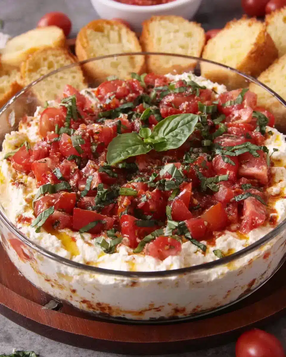 This Easy Bruschetta Dip Appetizer is perfect for game day, combining fresh tomatoes, creamy cheeses, and aromatic herbs for a delicious crowd-pleaser.