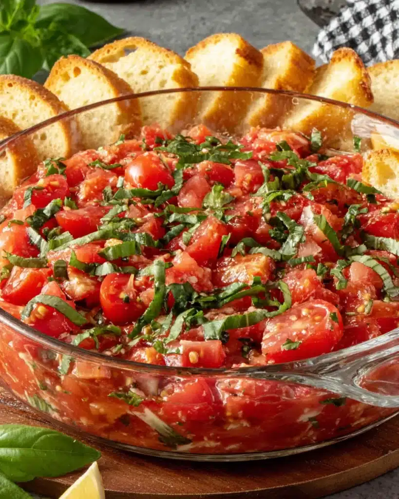 Delicious bruschetta dip appetizer with fresh ingredients.
