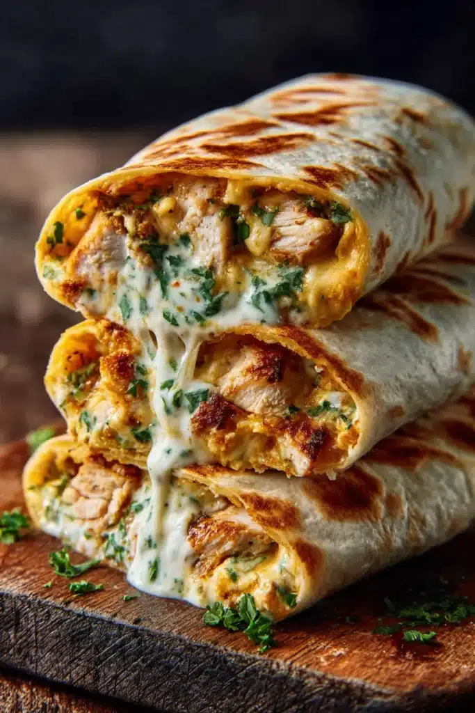 cheesy garlic chicken wraps with creamy sauce and grilled tortillas