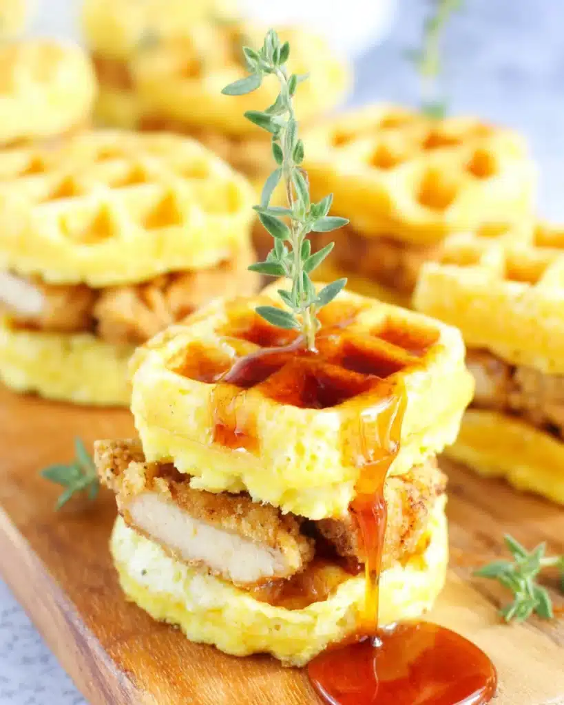 Chicken waffle sliders are a delightful combination of both sweet and savory flavors, thanks to the chicken, waffles, and a drizzle of maple syrup.
