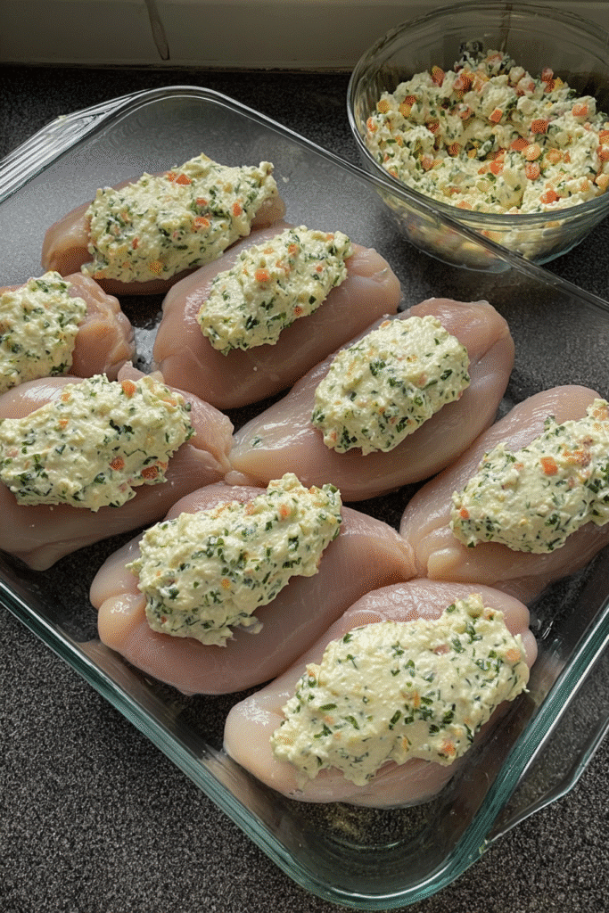 Arrange chicken breasts in the baking dish. Spread the creamy mixture evenly over the top, then sprinkle with the remaining Parmesan.