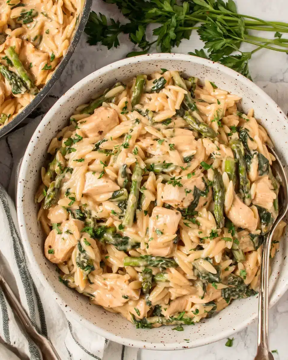 This dish features an array of fresh ingredients, including asparagus, spinach, and aromatic garlic. The combination of chicken, rich broth, and orzo creates a creamy texture that feels indulgent yet is healthy. Plus, each bite is bursting with savory goodness, making it a delightful choice for any meal.