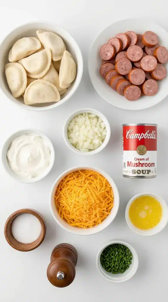 Ingredients of Crockpot pierogi casserole with kielbasa