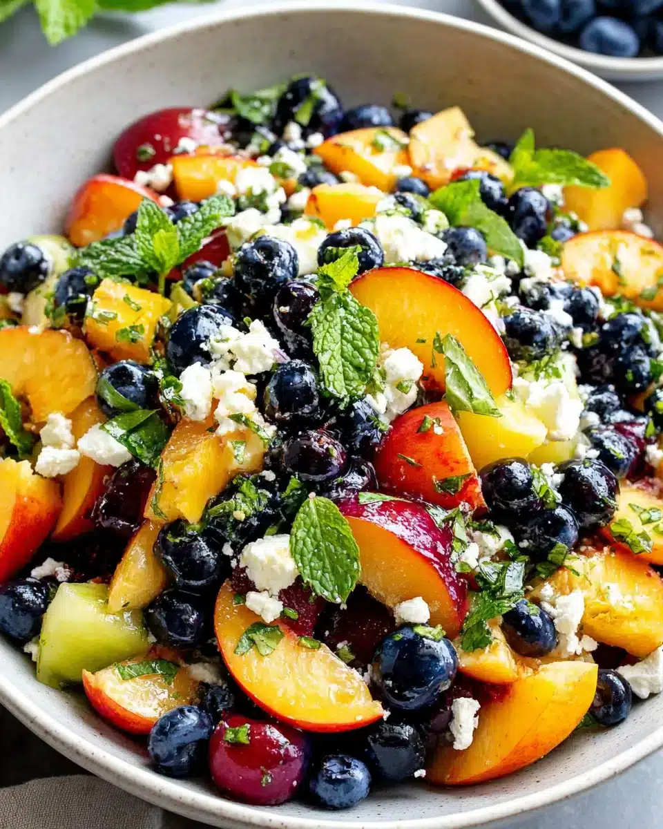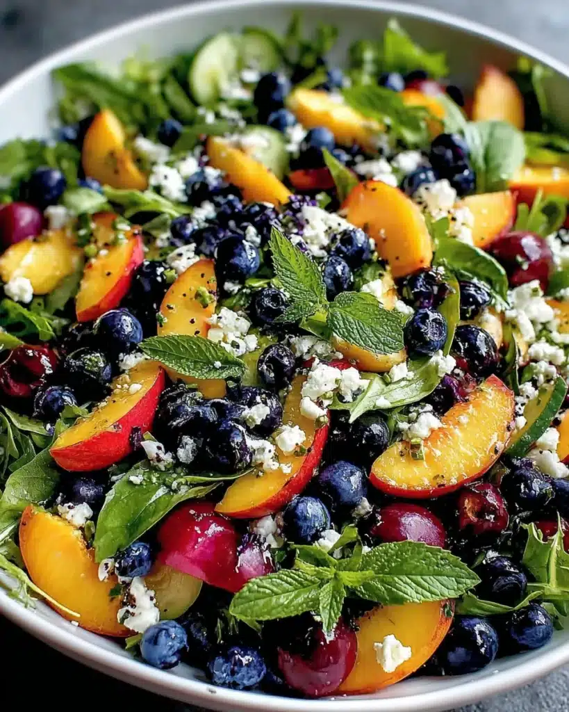 This salad combines beautiful colors and textures that make it visually appealing. The sweetness of the fruit perfectly balances the tanginess of the feta, while the nuts add a satisfying crunch. It’s quick to whip up, requiring just 15 minutes of prep time, allowing you to enjoy a gourmet salad with minimal effort. Whether it’s a picnic, a family dinner, or a sunny brunch, this salad is always a hit!