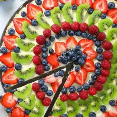 Chill the crust completely before spreading to prevent the topping from melting. Use ripe but firm fruit to keep slices looking fresh and avoid sogginess. For cleaner slices, chill the assembled pizza 15–20 minutes before cutting. Store leftovers covered in the refrigerator for up to 2 days. For a lighter version, swap full-fat cream cheese for a lower-fat alternative and adjust sugar to taste, or serve with a simple citrus glaze.
