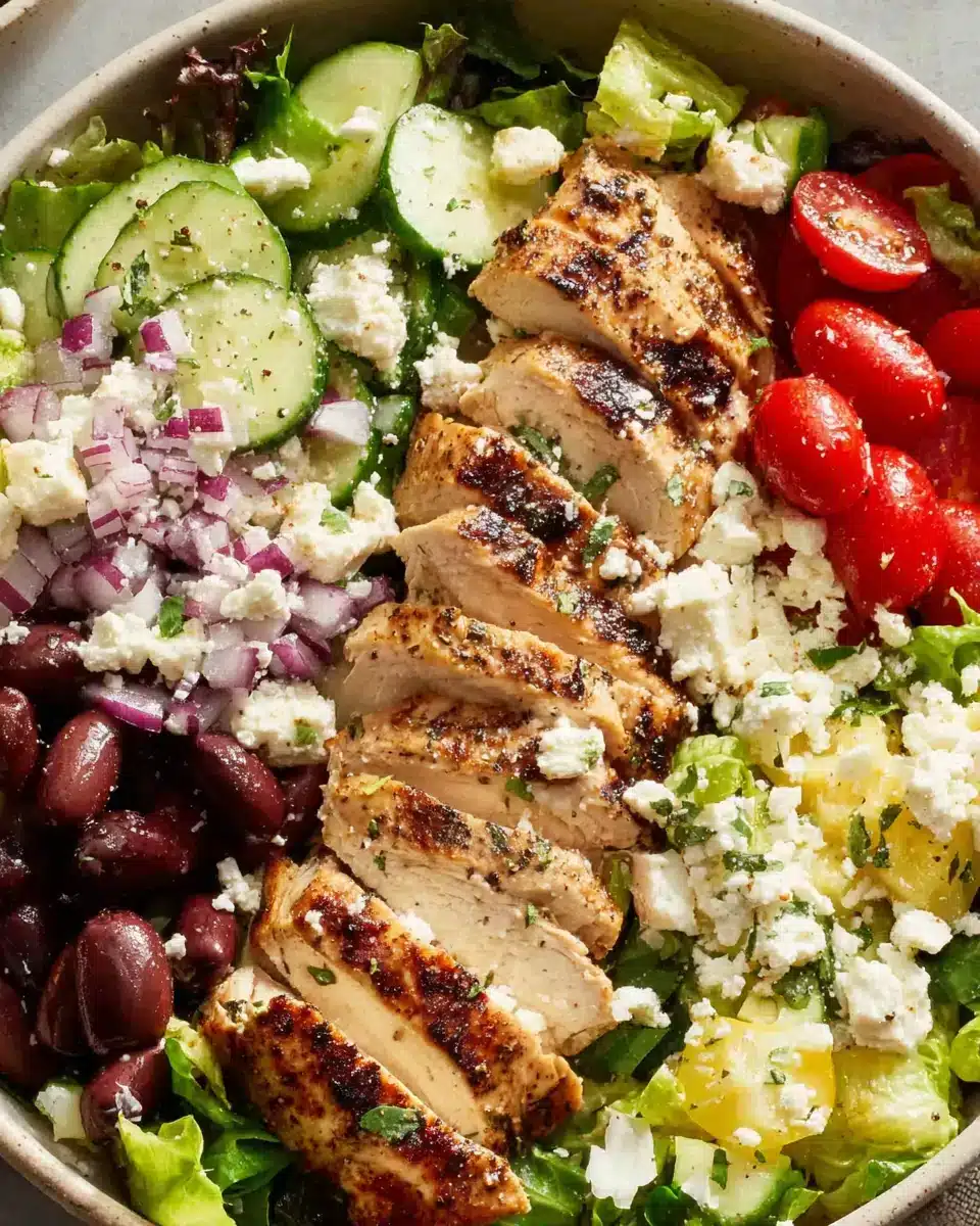 Start by placing the chopped lettuce in a large serving bowl or divide it into two individual bowls. Layer the salad with sliced chicken, tomatoes, cucumber, olives, and crumbled feta to create a vibrant base.