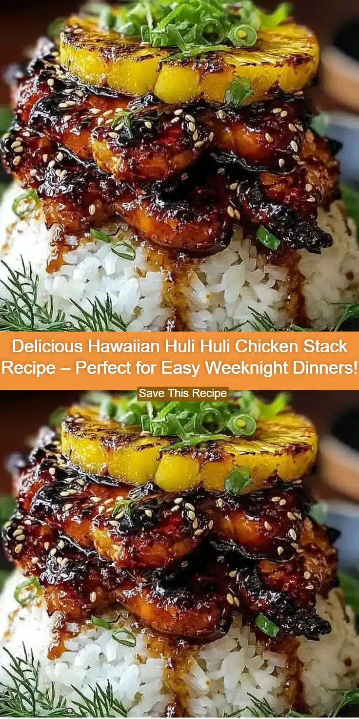 This Hawaiian Huli Huli Chicken Stack features tender grilled chicken layered with caramelized pineapple over a bed of rice, topped with a flavorful glaze, making it a perfect dish for weeknight dinners or casual cookouts.