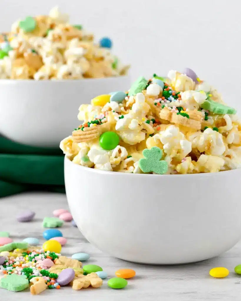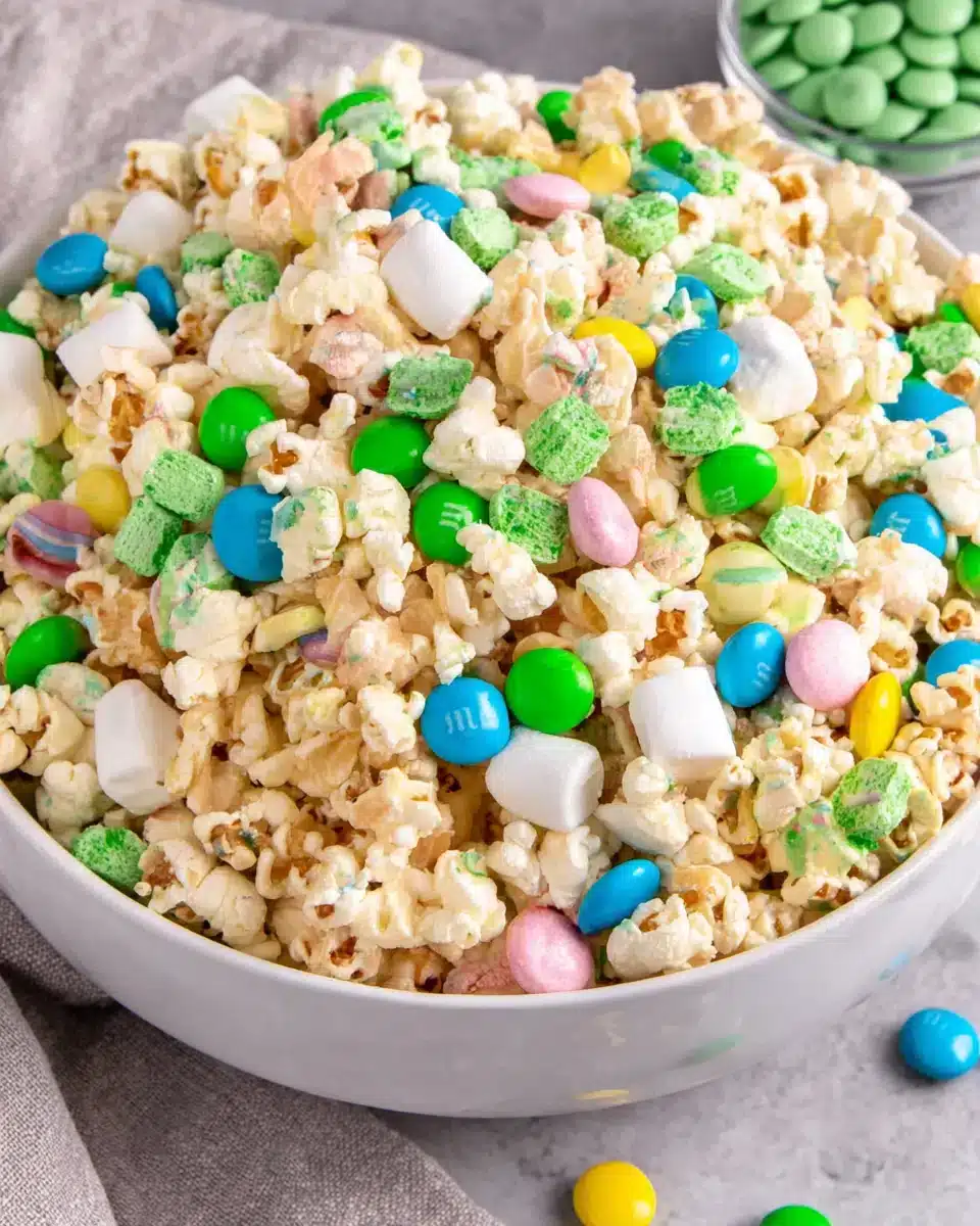 To make loaded leprechaun popcorn, mix plain popcorn with Lucky Charms cereal and coat it with a melted marshmallow mixture. Then, add mint M&Ms and sprinkles for a festive touch.