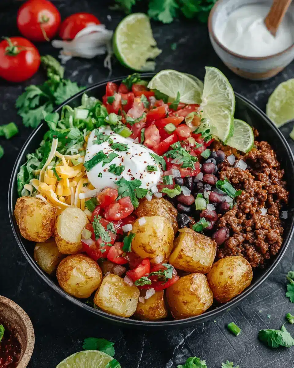 A Loaded Potato Taco Bowl is built with a handful of simple, satisfying ingredients that bring comfort and bold flavor to the table. Crispy roasted russet potatoes form the hearty base, while seasoned ground beef or turkey adds depth. Black beans, corn, and melted cheddar cheese create texture and creaminess, and fresh toppings bring the perfect finishing touch.