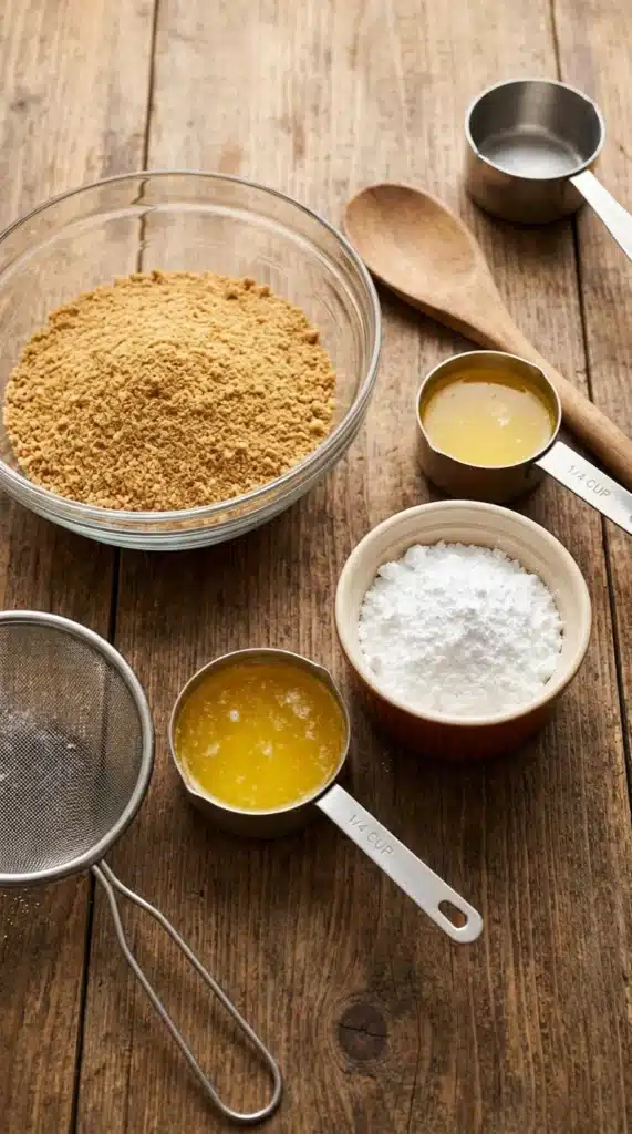 - Combine graham cracker crumbs, melted butter, and powdered sugar in a bowl, then press into a 9-inch pie plate to form the crust.