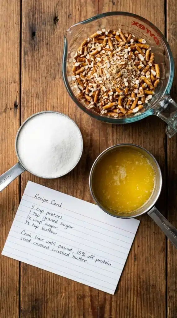 - Mix crushed pretzels, ¾ cup sugar, and melted butter, then press into the bottom of the baking dish.