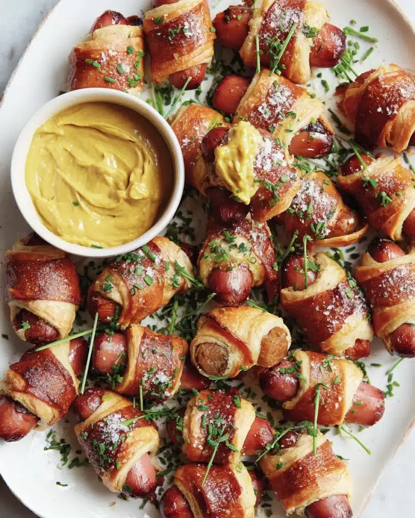 These Pigs in a Blanket are easy to make and perfect for your Super Bowl snacks, featuring flaky pastry wrapped around savory sausages.