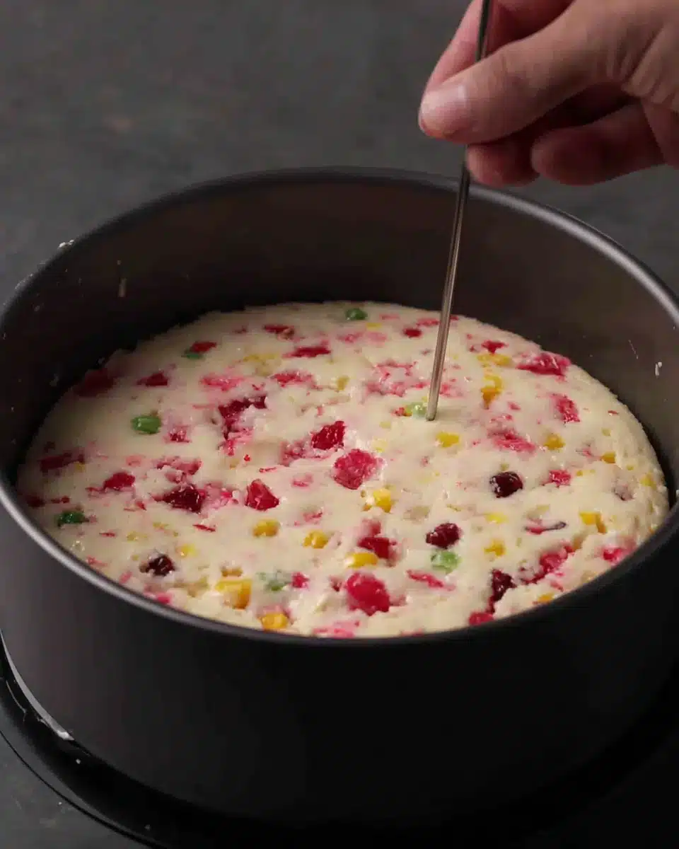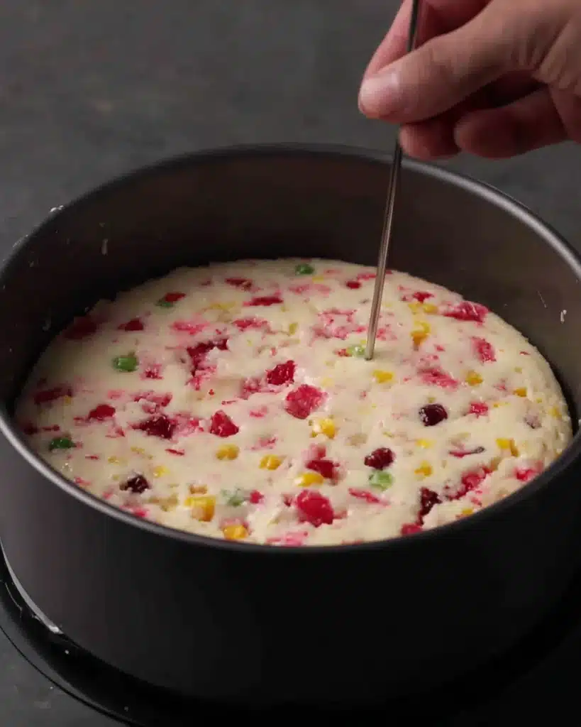• Fold in the red and yellow tutti frutti, then pour the batter into the prepared saucepan and sprinkle more tutti frutti on top.