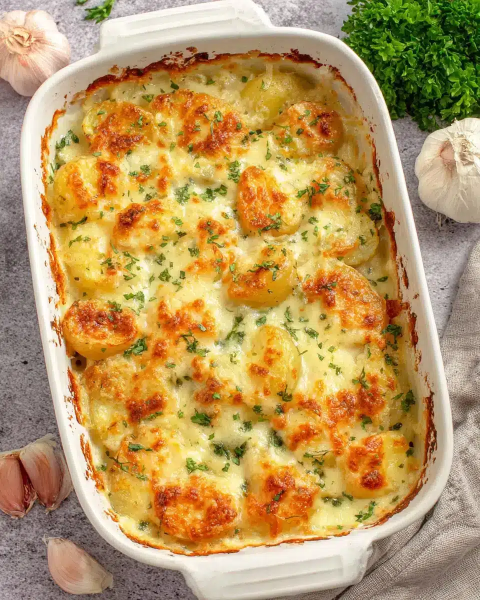 Roasted garlic potatoes are a creamy, flavorful side dish featuring tender layers of potatoes enveloped in a luscious garlic-infused cream sauce. The sweet, mellow notes from the roasted garlic blend seamlessly with the saltiness of cheese, offering a comforting experience with each forkful.