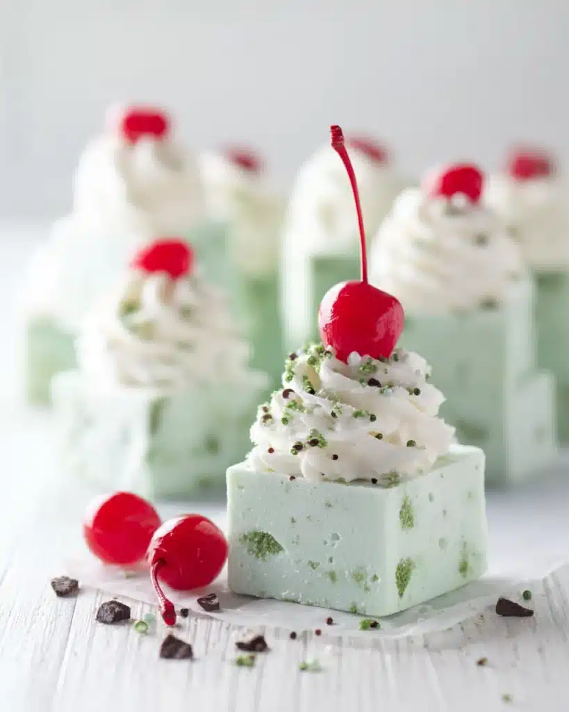 Pour the fudge mixture into an 8×8-inch prepared pan. If you’re feeling festive, sprinkle shamrock sprinkles on top for an extra touch of charm. Allow the fudge to cool to room temperature. Once cooled, lift it out of the pan onto a cutting board and cut it into approximately 24 pieces. Each bite is a taste of pure bliss!