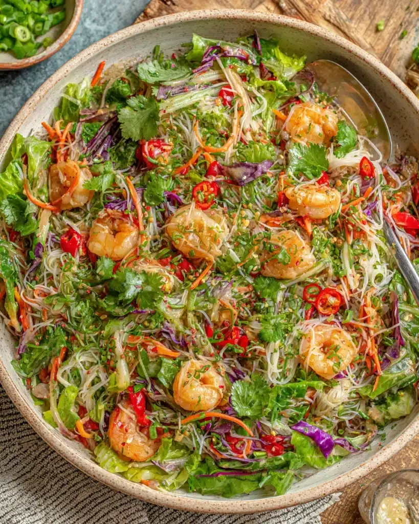 This salad is packed with fresh vegetables, herbs, and lean protein, making it a wholesome choice. The combination of rice vermicelli noodles, juicy prawns, and a variety of colorful veggies provides essential vitamins and minerals.