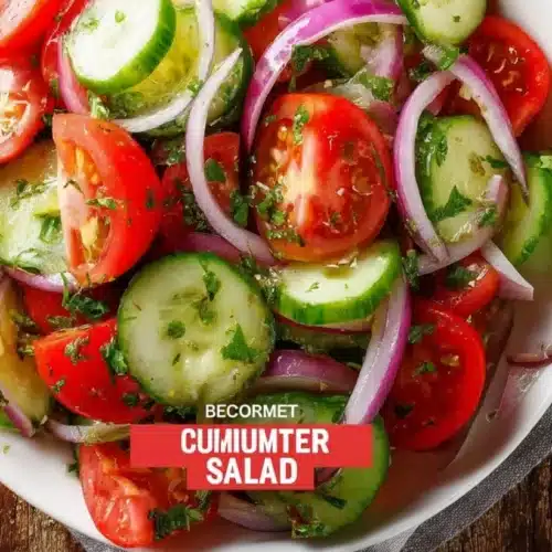 Bright, garden-fresh flavors make this salad a go-to for warm evenings and quick lunches. This Cucumber Tomato Salad has crisp cucumber, juicy tomatoes and red onion, all tossed in a tangy dressing.… For a heartier picnic combo, serve it with creamy cucumber chicken salad for a balanced plate.