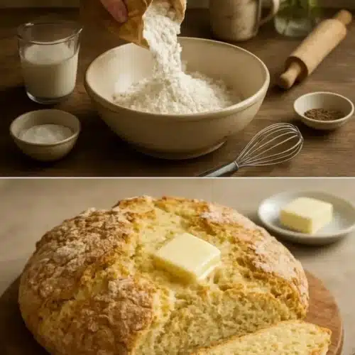 This bread is plain, hearty, and easy to bake. It needs no yeast and rises with baking soda. The taste is mild and the crumb is dense and soft. If you enjoy simple Irish bakes, try the Irish apple cake recipe for another easy treat.