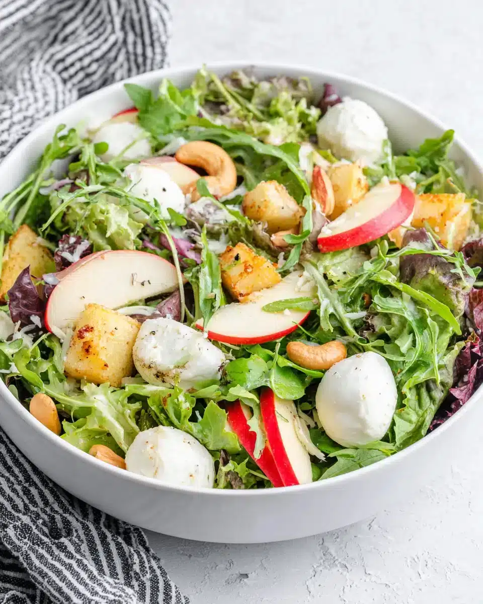 A vibrant spring salad with apples, greens, mozzarella, and cashews.