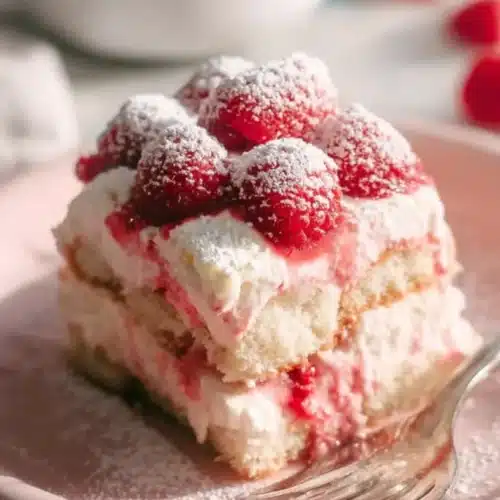 Chill at least 4 hours, preferably overnight, to let layers set and flavors meld. Don’t soak ladyfingers — quick dips prevent a soggy dessert. Use full-fat mascarpone and heavy cream for best texture and stability. Cool the raspberry syrup completely before folding into the filling to avoid thinning it. Store covered in the fridge up to 3 days, or freeze portions for longer keeping.